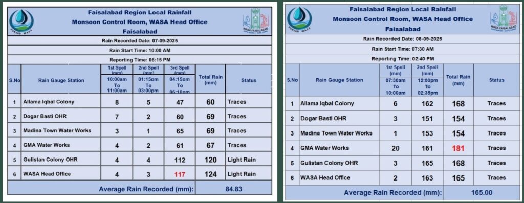 According to WASA Faisalabad, on Sunday, September 7, the heaviest rainfall was recorded in Civil Lines—124 millimeters—where WASA’s own headquarters is located. Other figures for that day included 120mm in Gulistan Colony, 67mm in Ghulam Muhammadabad, 69mm in Madina Town, 69mm in Peoples Colony, and 60mm in Allama Iqbal Colony.